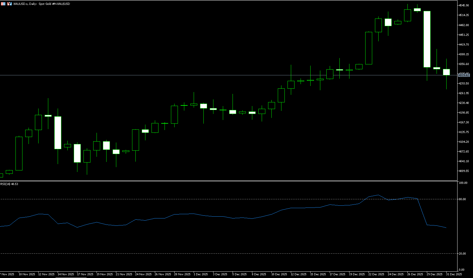 On Thursday (January 1, 2026), most global markets were closed for the New Year holiday, resulting in thin trading. Gold prices closed lower on Wednesday, but achieved a remarkable gain of approximately 64% for the year 2025, marking the largest annual gain in nearly 46 years since 1979. On the last trading day of 2025, spot gold fell 0.6% to $4318.67 per ounce. Silver plunged 6.7% to $71.36. Short-term prices fluctuated under profit-taking pressure, but the long-term outlook remains optimistic. Some believe that gold could reach $5,000 per ounce in 2026, and silver could challenge $100. Currently, gold prices have broken below the key resistance level of $4,381.20, which has been in place since October, and are currently trading at $4,318. Aggressive bulls who bet on a breakout are now trapped. The key 50-day moving average at $4,180.60, a core trend indicator that has driven gold prices higher since August, is now in jeopardy.