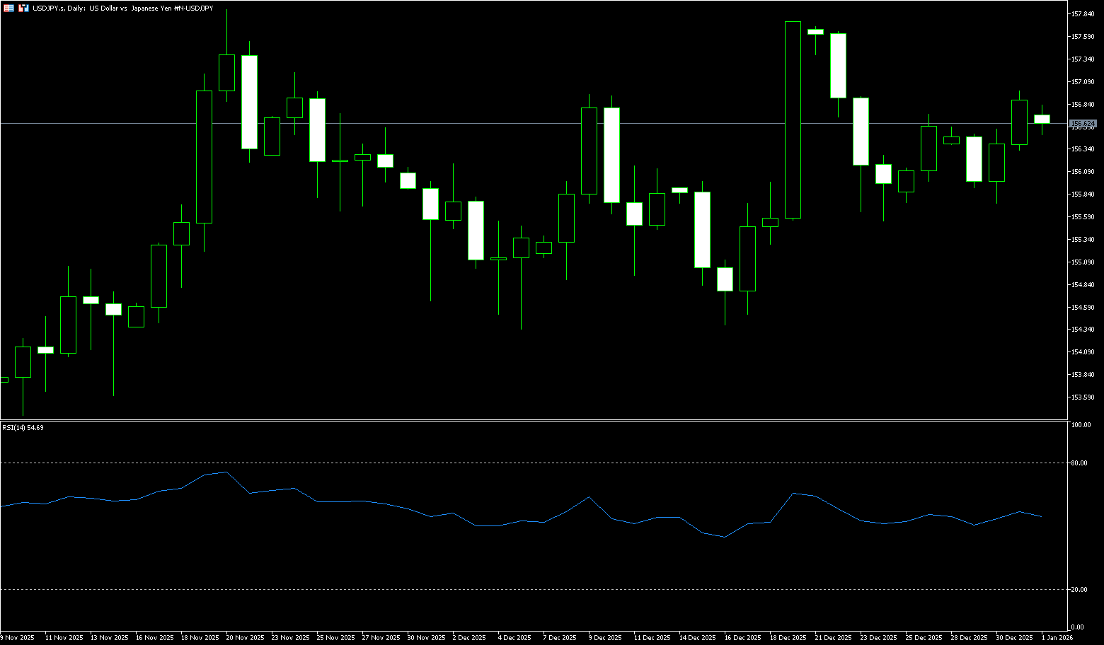 From the daily chart, USD/JPY is currently in a typical consolidation market structure. The previous rally formed a clear supply zone near the psychological levels of 157.89 and 158.00, followed by a pullback and repeated fluctuations, with the exchange rate gradually settling above 155.700. The current price is near the upper limit of the range, indicating that bulls are still attempting to resume the upward trend, but the upper resistance zone is dense, and a breakout will require stronger momentum and more ample liquidity. The key support level to watch is first at 156.00-155.70, which acts as a dividing line between bullish and bearish sentiment: holding above this level suggests a consolidation phase after a pullback; a decisive break below this level could lead to a retest of the 154.850 area, or even a deeper pullback to the previous low of 154.342.