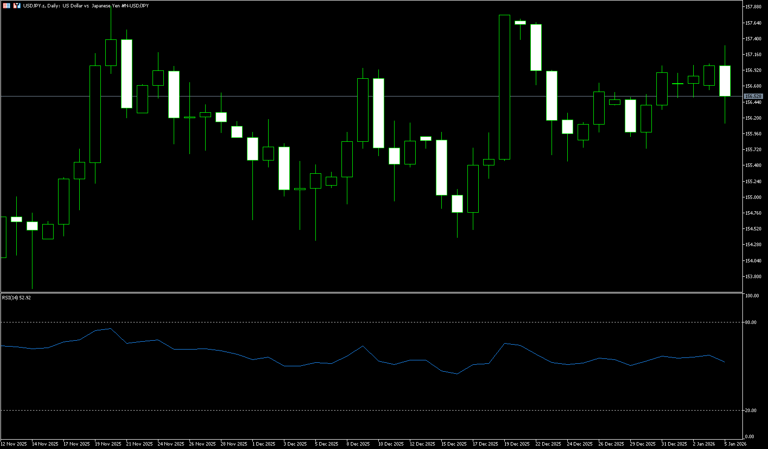 Overall, the strength of the USD/JPY pair stems largely from the difference in the pace of monetary policy between the US and Japan. With the Bank of Japan remaining cautious and the Federal Reserve yet to clearly initiate rapid easing, the exchange rate is more likely to rise than fall. However, it's important to be wary of the Japanese government's close attention to the exchange rate, which means that if the yen depreciates too rapidly, the risk of policy intervention will increase significantly. In the short term, the USD/JPY pair may maintain a high-level, slightly bullish trend, but the risk of a pullback should not be ignored at key resistance levels. From a daily chart perspective, the USD/JPY pair maintains a clear upward trend. The exchange rate continues to trade above major moving averages, with short- and medium-term moving averages in a bullish alignment, providing support. The 14-day Relative Strength Index (RSI) is at a high of 56.67, but has not yet entered the extreme overbought zone, indicating that upward momentum remains, but short-term volatility risk has increased. Resistance is seen in the 157.51 (upper Bollinger Band) – 157.89 (November 20 high) area. A decisive break above this level could open up further upside potential to 158.00 (psychological level), while a break below that would target 158.88 (January 20th high). Support lies in the 156.15 (34-day simple moving average) – 156.00 (psychological level) area. A break below this level could trigger a technical pullback to the upper Bollinger Band at 154.87.