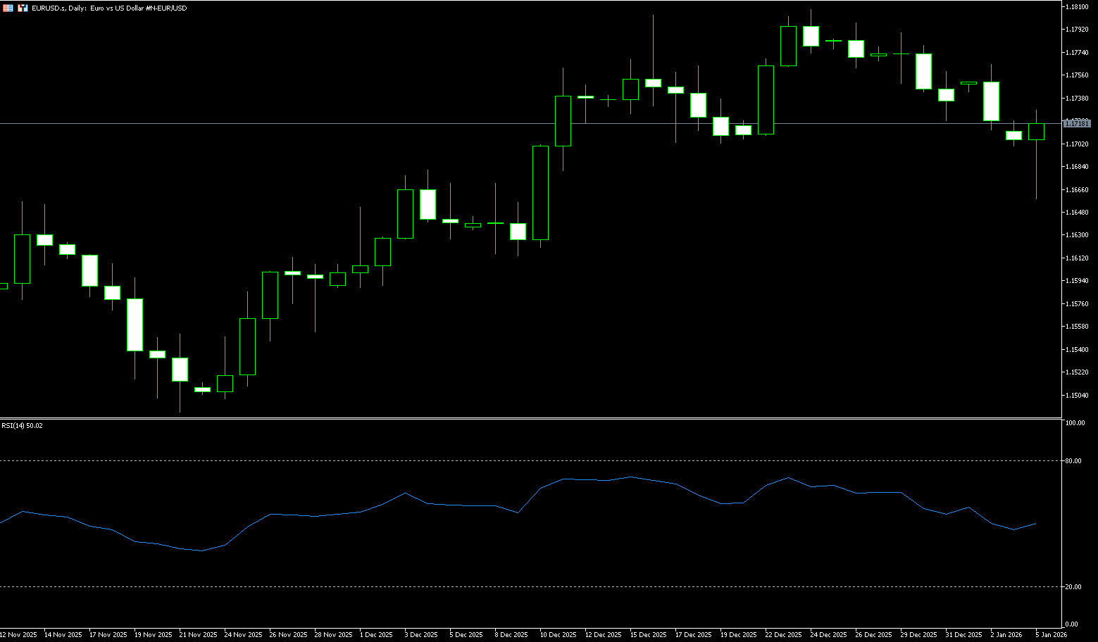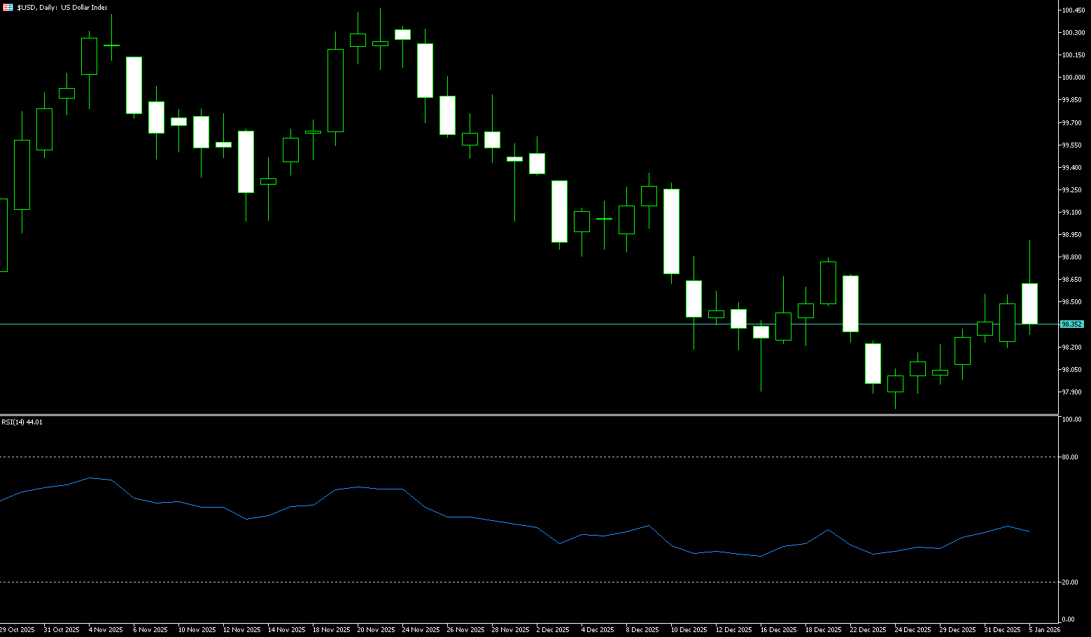 Historical trends may provide support for the dollar. Looking back at 2017, during Trump's first term as president, the dollar index weakened significantly; however, by 2018, the dollar had gradually recovered some of its losses. This pattern of "rebound the following year" may repeat itself in 2026. Currently, the dollar index is generally showing a weak and volatile trend this week, with intense short-term battles between bulls and bears. A break below 98.00 (the psychological level) and 97.75 (the low of December 24th) would likely give way to bearish sentiment. The daily chart shows a short-term bearish bias, with weak rebounds and an overall fragile position. Furthermore, the price action after rebounding from 97.75 has been somewhat hesitant. The Relative Strength Index (RSI) is below the 50 midline, indicating moderate downward pressure, but it has not yet entered oversold territory, suggesting insufficient rebound momentum. The 10/20/50-day simple moving averages are all in a bearish alignment, providing resistance. On the upside, if the US dollar index can regain above 98.50 (last week's high), the upward momentum may extend to 98.90 (the 200-day simple moving average) and the 99.00 (psychological level); however, if it breaks below 98.00 and 97.75 (the December 24 low), the short-term direction may turn bearish. The target will be 97.46 (the October 1 low), and in extreme cases, the 97.00 (psychological level).
