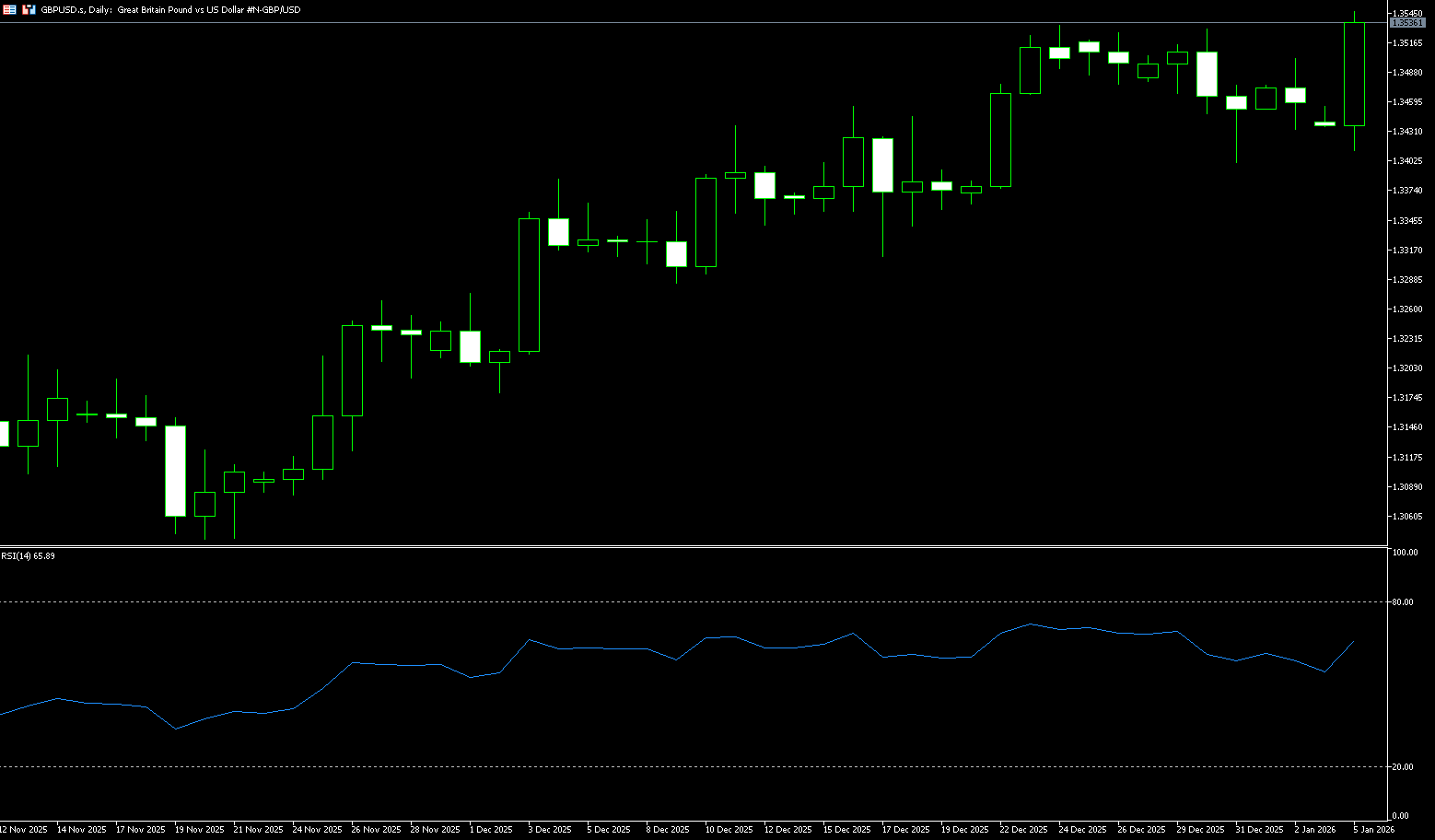 In the final quarter of the year, GBP/USD was at 1.3010 {the low on November 5th last year}. Strong support was found in the 1.3000 psychological support area as the dollar suffered another blow. Looking at the monthly timeframe, the pair has formed an ascending triangle pattern in 2025, with the resistance path in early 2026 appearing upwards. In this scenario, pound bulls must break through the horizontal trendline resistance around 1.3785 to confirm the triangle breakout. Acceptance above this barrier would push the bulls initially towards 1.3534 (the high of December 24th last year). The 14-day Relative Strength Index (RSI) is currently near 60, indicating that the market's upward momentum is neither overheated nor weak. The MACD pattern suggests that the pound/dollar pair's upward momentum remains strong, with bulls dominating. However, the psychological level of 1.3600 may pose an initial challenge for the bulls. The next key level is the trendline resistance at 1.3785. Additionally, the psychological level of 1.3400... The immediate support level is within the converging range of the -1.3368 {100-day simple moving average}, which, if challenged, could trigger a tactical pullback on any retracement. This area corresponds to the 1.3301 {lower Bollinger Band} and the 1.3300 {psychological level}.