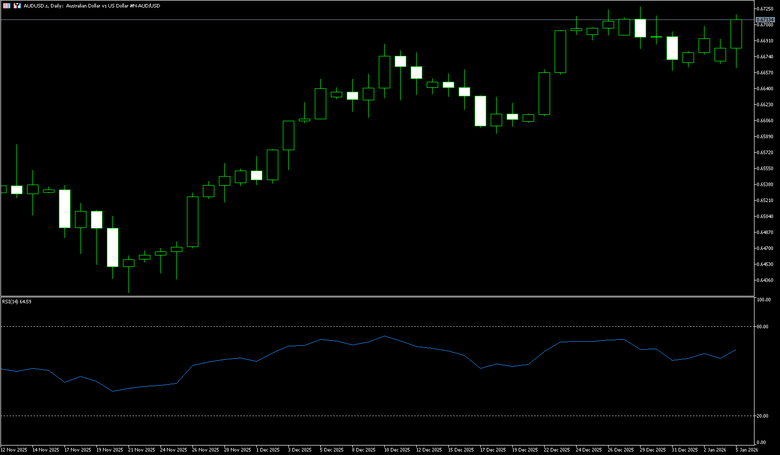 Technical analysis of the daily chart shows that the AUD/USD pair repeatedly fluctuated around the psychological level of 0.6700 last week. It is currently trading slightly below 0.6700. The currency pair is currently in an ascending channel pattern, suggesting a continued bullish bias. AUD/USD remains above the rising 20-day simple moving average at 0.6662, maintaining its short-term uptrend. This moving average has been solid in recent trading, enhancing the incentive to buy on dips. The 14-day Relative Strength Index (RSI) is near 62 and has risen slightly, but has not yet reached overbought levels. Currently, AUD/USD is testing immediate resistance at the psychological level of 0.6700, followed by 0.6727, the highest level since October 2024, reached on December 29th, and the 0.6731 area (the upper Bollinger Band). A further break above the latter would support the pair exploring the area near the upper boundary of the ascending channel, targeting 0.6770 (the high of October 8th last year), and further towards the psychological level of 0.6800. On the downside, initial support lies at the 20-day simple moving average at 0.6663, and... The 0.6659 area (last week's low) is a key level to watch. A break below this level would open up opportunities for the AUD/USD pair near the 34-day simple moving average (around 0.6607) and the psychological level of 0.6600.