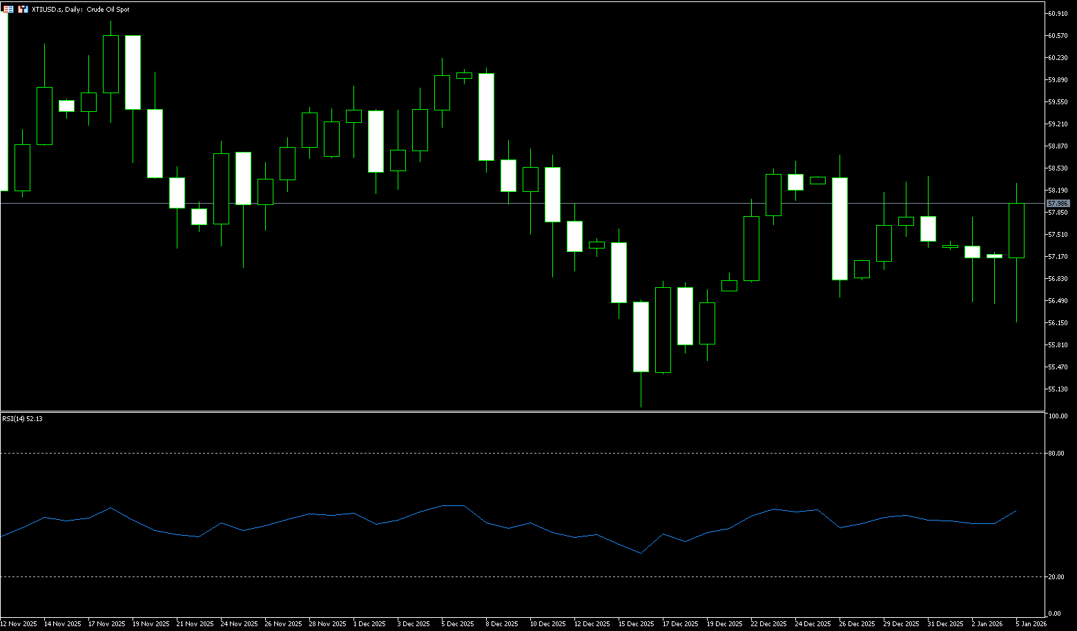 The daily chart shows that US crude oil experienced a significant technical rebound after forming a recent low around $54.88, with a short-term pattern resembling a V-shaped reversal followed by a pullback. The current price is between two key levels: $55.36 (lower Bollinger Band) and $58.75 (50-day moving average). In terms of indicators, the MACD momentum is recovering, but the medium-term trend of a bearish bias around the zero line has not yet reversed. In other words, the bulls have the will to attack, but it is not yet time to completely reverse the situation. The market is more likely to follow a pattern of "rising for a while and then pausing for a while". The RSI (14) is about 46.05, close to the midline, indicating that the market is neither extremely overbought nor extremely oversold, and the sentiment is neutral. Combined with the current K-line structure, it is closer to the characteristics of range oscillation and volatility convergence. On the upside, $58.75 (50-day moving average) is the first resistance point, while $60.00 is the "watershed" that the rebound needs to overcome. Only if the oil price effectively stands above $60.00 will it be more likely to open up the upside space to test the resistance zone near $60.50 and even the previous high of $61.50. As for the downside, if the $56.58 (December 26 low) and $55.36 (lower Bollinger Band) area are breached, the next level will be $55.14 (May 5 low) and... $54.88 (December 16 low).