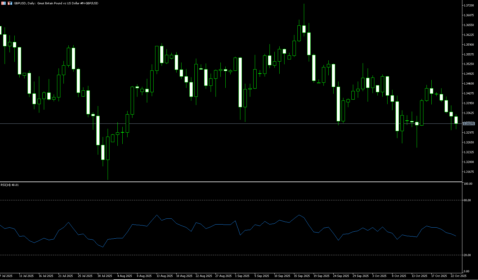The daily chart shows GBP/USD trading just above 1.3320. Recent price action suggests a period of consolidation following a series of lower highs and higher lows. The pair remains trapped between its 50-day simple moving average (SMA) of 1.3468 and its 200-day SMA of 1.3215, a range that reflects hesitation among traders. The 14-day relative strength index (RSI) is currently hovering near 40, indicating a slightly bearish momentum bias but not yet entering oversold territory. This suggests sellers have the upper hand. The pair has repeatedly tested 1.3248 (October 15 low) and its 200-day SMA of 1.3215, indicating that these levels continue to serve as key dynamic support. Meanwhile, a rebound attempt towards the 1.3400 level and the 50-day simple moving average at 1.3468 failed to gain traction, highlighting the importance of these levels as near-term resistance.