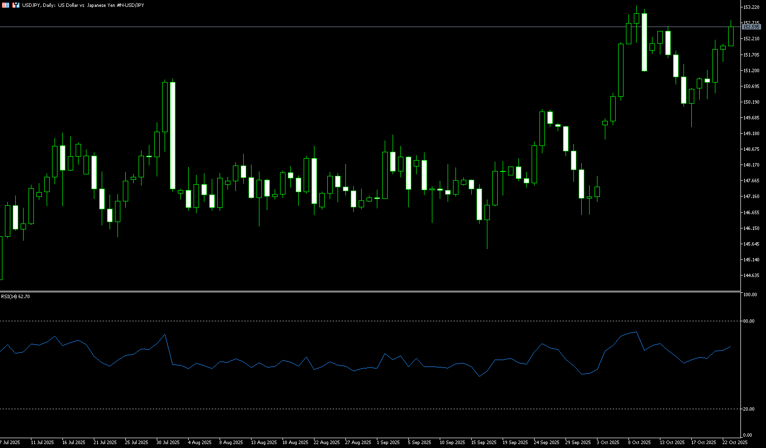 The daily chart shows that USD/JPY experienced a slight technical pullback to 151.80 midweek. Technical analysis on the daily chart suggests that the pair's bullish bias remains intact. On the upside, initial resistance lies at 152.75, the recent high set on October 14. A break above this level would support the pair's move towards the psychological level of 153.00 and the eight-month high of 153.27 set on October 10. Immediate support lies at 151.45 (the 20-period moving average on the 12-hour chart). A break below this level would weaken short-term price momentum and prompt USD/JPY to test the psychological level of around 150.00.