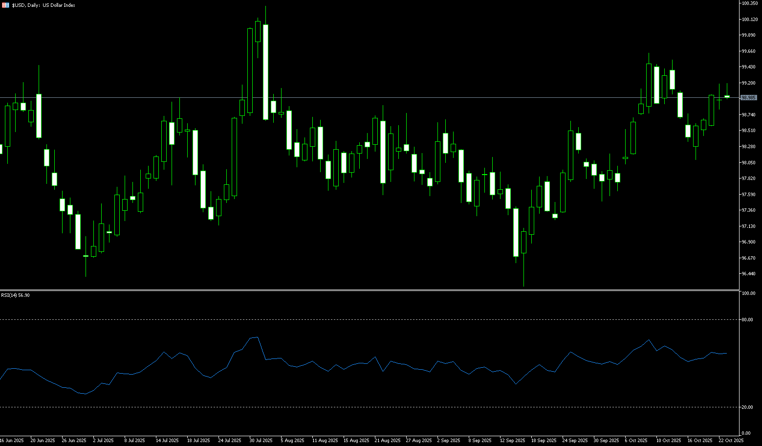 The US Dollar Index remains range-bound between 98.12 (100-day SMA) and 99.52 (170-day SMA), forming a tight structure. The recent rebound from 97.46, the previous high at the beginning of the month, demonstrates defensive strength, but upward progress has stalled. The US Dollar Index is balancing low volatility against unconfirmed fundamentals: a classic prelude to an eventual market rebound once clarity emerges. Therefore, upside targets include 99.52 (170-day SMA) and 100.00 (psychological level). On the downside, key levels to watch include 98.52 (20-day SMA) and 98.12 (100-day SMA).