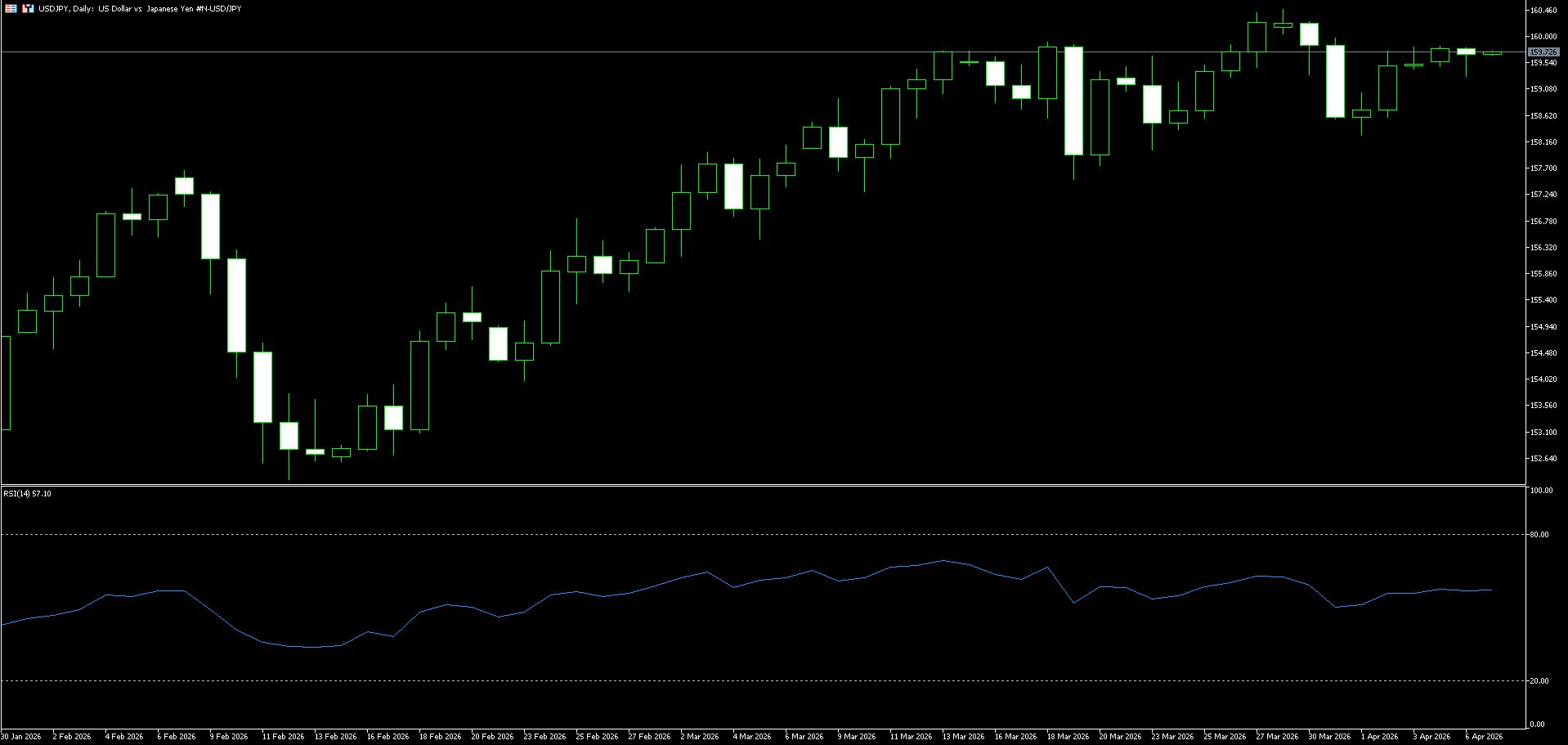 The USD/JPY exchange rate traded flat around 159.65 in early Asian trading on Monday. The rate remained stable as traders continued to assess the latest developments in the US-Iran conflict. USD/JPY maintained its upward trend. The short-term bias is bullish, as the USD/JPY is holding above the 20-day simple moving average around 159.20 and continues to respect the ascending parallel channel established since mid-March. The 14-day Relative Strength Index (RSI) is around 56, maintaining positive momentum and indicating that pullbacks within the channel are still supported, not a sign of a top formation. Immediate support lies around the 159.20 (20-day simple moving average) and 159.00 (psychological level) area, followed by the 30-day simple moving average clustered around 158.45. A break below this area exposes the next support at 157.40, the intersection of the previous consolidation base and the channel projection. Resistance is seen at 160.00 (a psychological level), followed by last week's high of 160.46. A close above 160.46 would confirm a new upward extension, targeting the 161.05 (key weekly resistance) – 161.50 area.