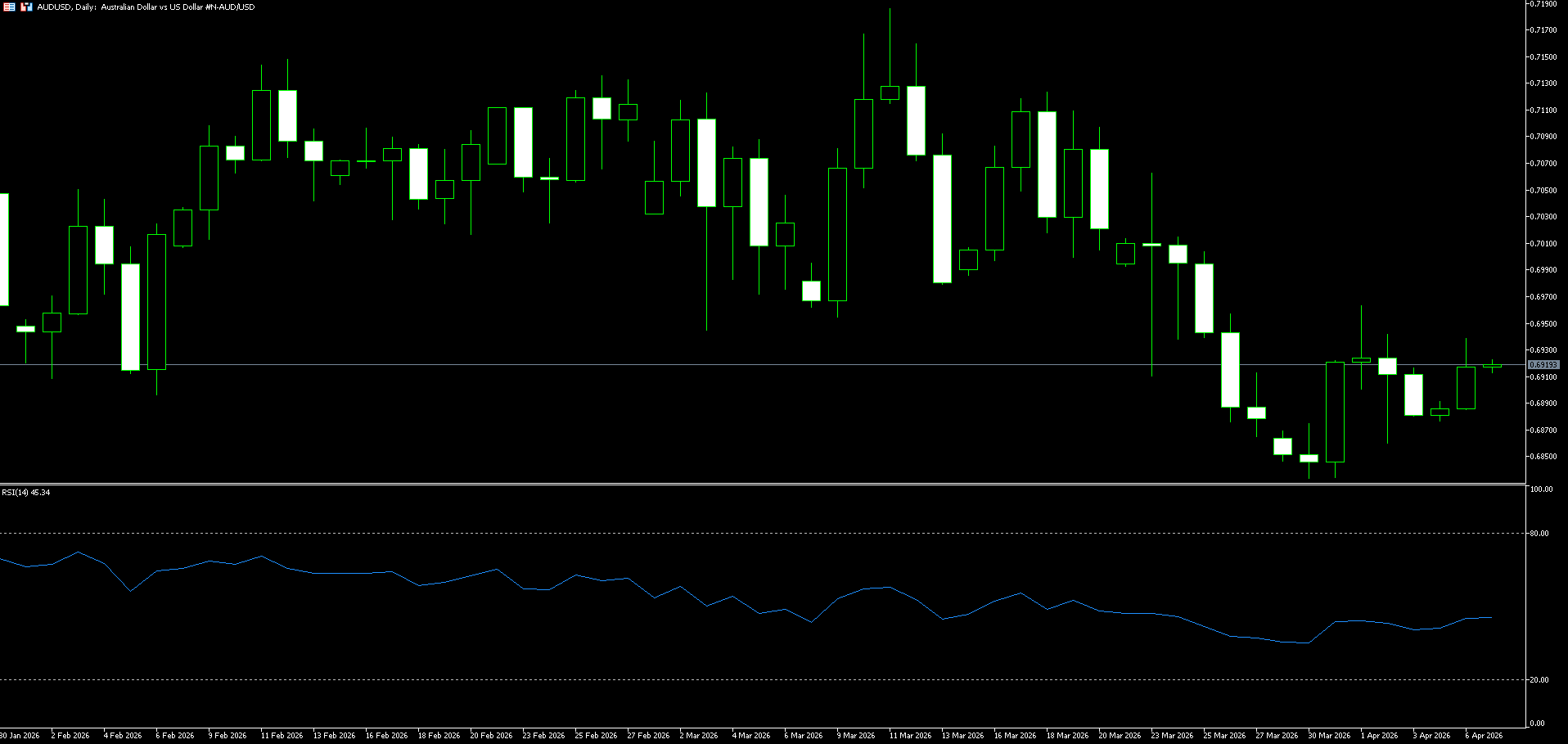 The Australian dollar rebounded slightly against the US dollar on Monday, approaching 0.6915. The dollar strengthened against the Australian dollar due to stronger-than-expected US jobs data and geopolitical tensions in the Middle East. Data released by the US Bureau of Labor Statistics on Friday showed that US non-farm payrolls increased by 17,800 in March. This data significantly exceeded market expectations of a 6.0K increase. The unemployment rate in March slightly decreased to 4.3% from 4.4% in February. Escalating tensions between the US and Iran and concerns about the closure of the Strait of Hormuz continue to boost safe-haven currencies such as the US dollar, posing short-term resistance to the AUD/USD pair. Market expectations for the May meeting lean towards another rate hike due to rising oil prices and a tight labor market. Westpac analysts predict the Reserve Bank of Australia will raise rates three more times by 2026, reaching a cash rate of 4.85%, the highest level since November 2008.