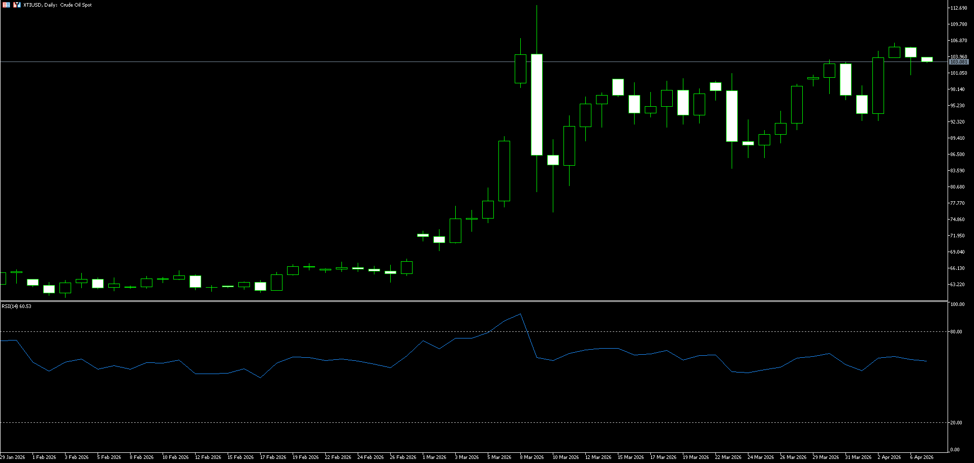 Today, consider going long on crude oil at 103.60, with a stop loss at 103.40 and targets of 105.50 and 106.50.